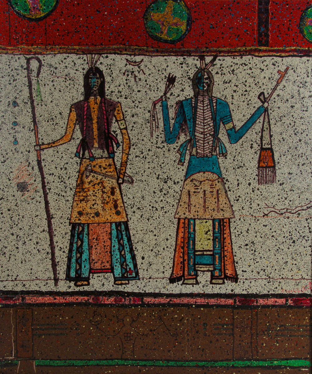1951 3 Wise Men 1988 Mixed media on paper Signed and dated in red pencil R Lee White 88 lower right Titled lower left. Randy White is known for pseudo pictographs mixed-media abstraction posed as Indian. Randy White is known for Pseudo pictographs mixed-media abstraction posed as Indian.